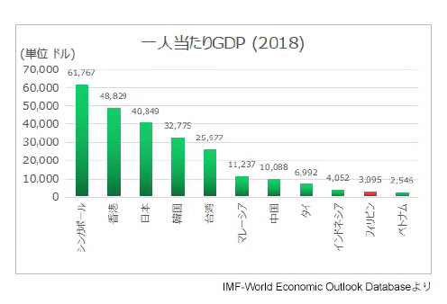 ここに示したのはASEAN諸国のGDP推移です。フィリピンは下から2番目の黄色のトレンドになります。ASEAN諸国で第2位の人口を持ち、1億人を超える国としてはGDPは大きくないことが分かります。