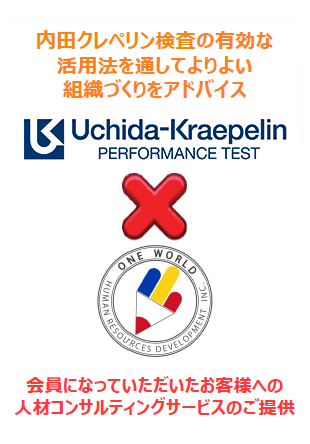 We believe that human resources are treasure and the optimal placement of human resources will become increasingly important for the development of companies hereafter. One World Human Resources Development Inc. offers human resource utilization method through sales and implementation of Uchida-Kraepelin test which has more than 60 years history and more than 50 million people in Japan. And we support your company's development through further effective advice.
