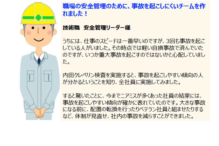 ◆内田クレペリン検査と鉄道事故の相関に基づき、個人の適正だけでなく集団単位で事故の発生確率をコントロールするといった統計的な活用があります。